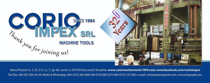 CORIO IMPEX S.R.L. "since 1994" Founded by Copaciu Teofil - Technical Director Import-Export & Technical Assistance Machine-Tools Office : Aleea Plesesti nr.3 , Sector 3 032784 Bucharest - Romania , European Union Tel/Fax: 004-031-804.26.49 Mobile : 004-0729.88.36.74 (also WhatsApp) 004-0722-28.46.69 E-mail: corioimpex@gmail.com, coriosrl@gmail.com , camellia.radoi@gmail.com Web: https://www.coriomachinetools1994.com/ fb www.facebook.com/corioimpex www.linkedin.com/in/radoi-florin-98647998 Any machines for sale ? Send us your offer and we can help you to sell it !